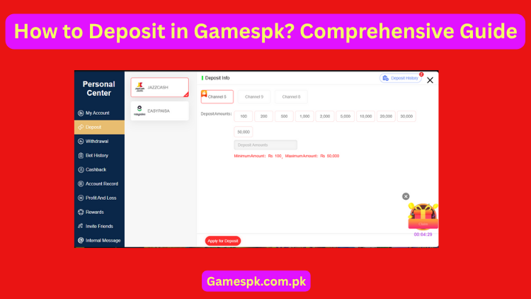 Gamespk is an online casino gaming platform. This game’s trend is increasing daily due to its high demand in Pakistan. The promotion of this platform in Pakistan is through different social media platforms and the referral system. The deposit in Gamespk procedure is very simple and easy. The following is a simple guide on Deposit in Gamespk.